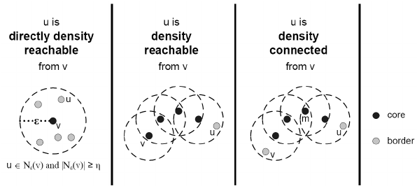 In the third diagram, u and v are density-connected because both are density-reachable from a common core point m.
