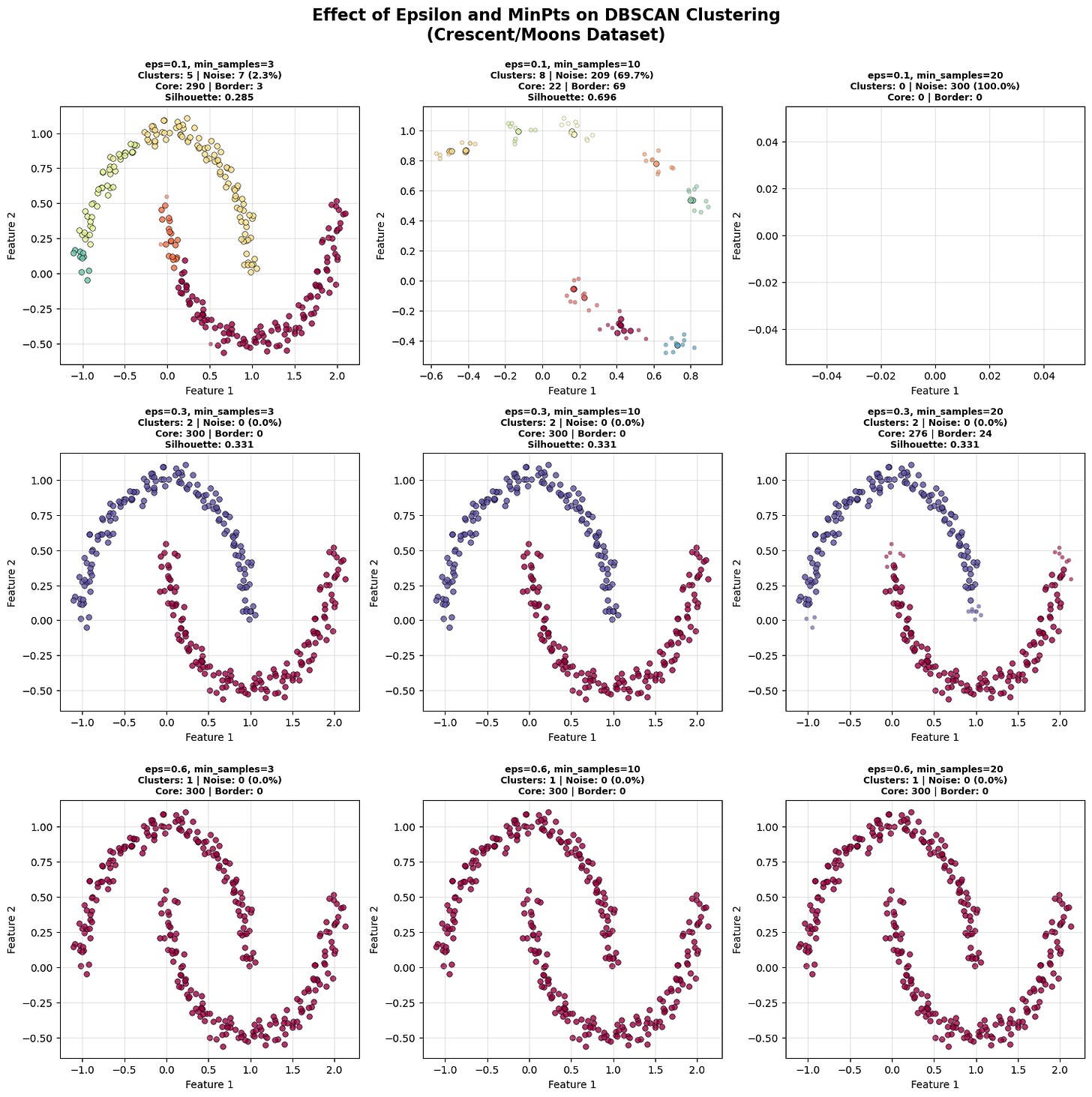 For the above dataset the sweet spot (medium ε ≈ 0.3, MinPts = 3–10) forms well-defined, separate clusters that match the structure of crescent-shaped data.